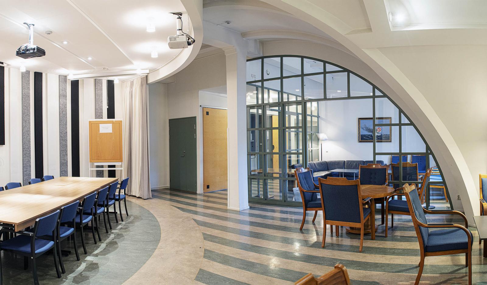 Våra två konferensrum finns på 5.e våningen. Vi har ett större konferensrum med två videoprojektorer och whiteboard tavla där vi kan erbjuda upp till 50 personer att sitta i biosittning. I anslutning till det större konferensrummet finns en soffgrupp.
