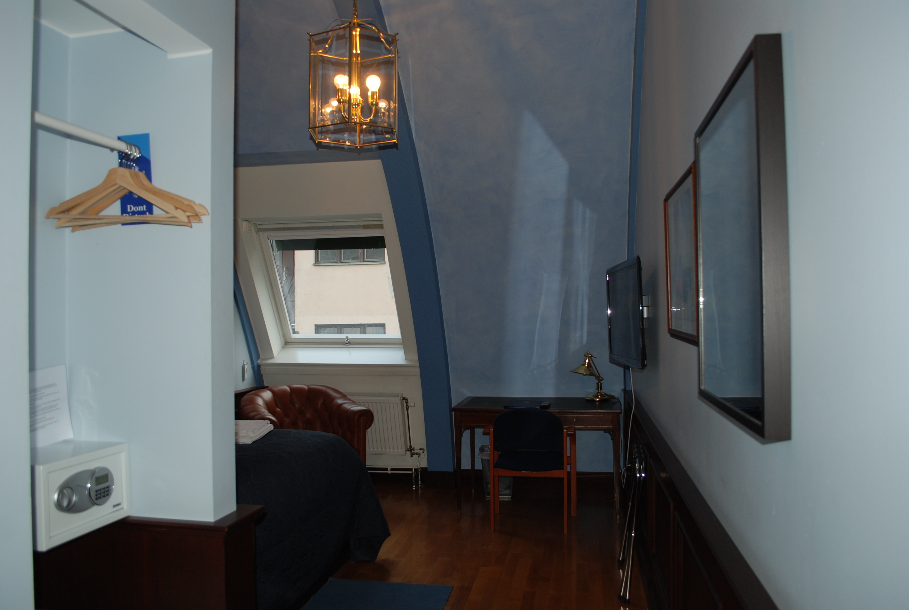 Sängen är 105 cm bred och 210 cm lång. Garderob med hyllplan. TV. Trådlöst wi-fi.